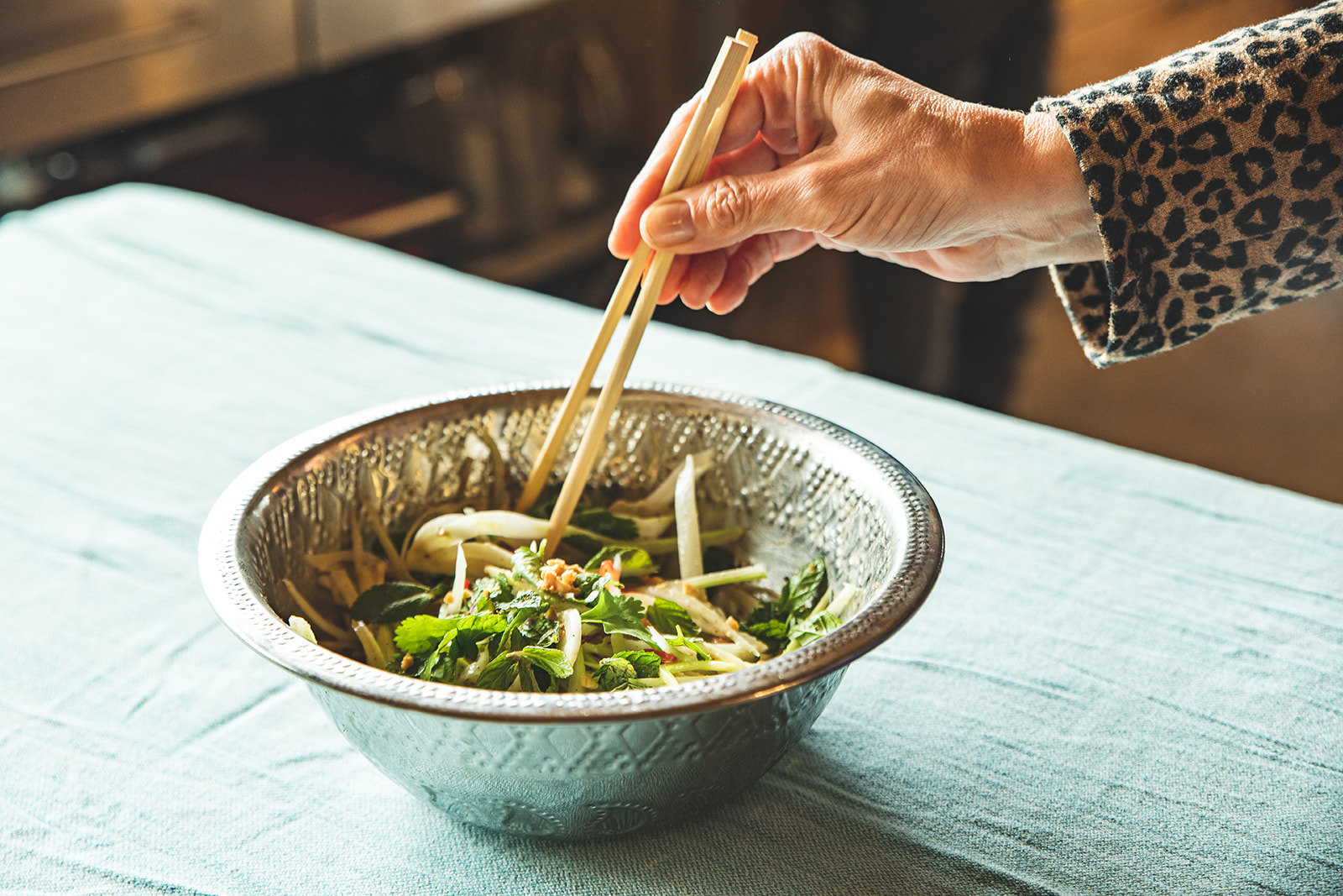 מרכיבים ומגישים: שמים בקערה את כל מרכיבי הסלט, מוסיפים את הרוטב, מערבבים ומגישים.